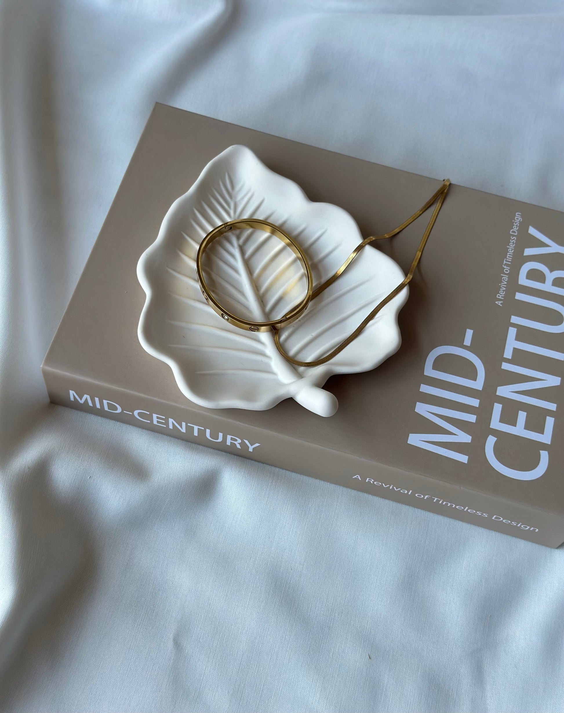 A handcrafted leaf-shaped tray made from eco-friendly Jesmonite. Perfect for holding jewelry, keys, or small treasures — adding natural charm and elegance to any space.