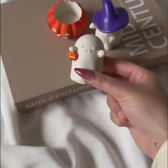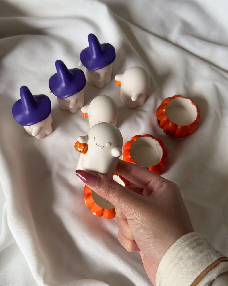 Pumpkin Ghost Set (3 pcs) – Handcrafted Jesmonite ghosts in a charming minimalist design. Perfect for seasonal décor, styling shelves, or gifting. Custom colours and finishes available.