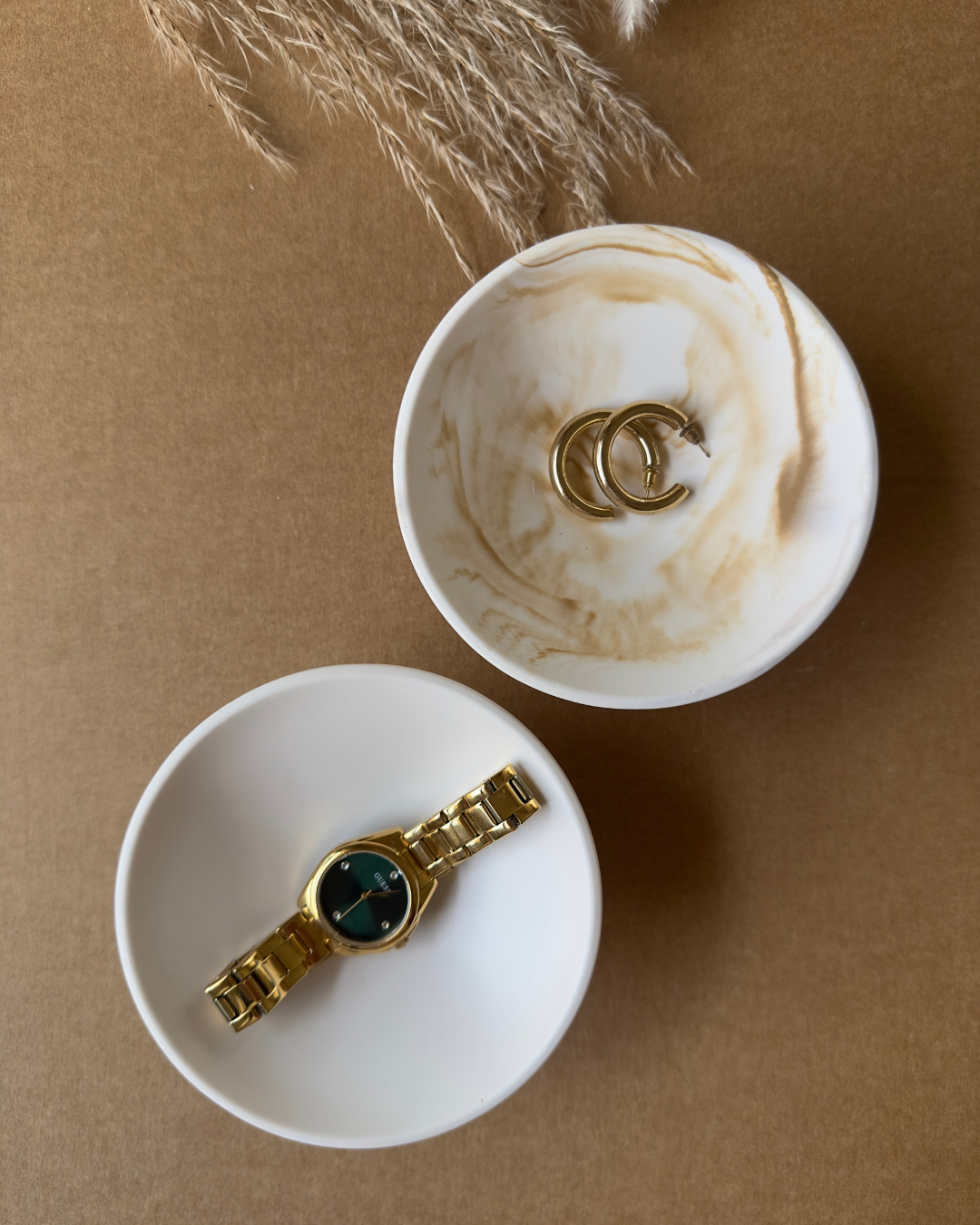 A modern, minimalist pedestal bowl for jewelry, keys, or beauty products. Customizable colors available. Made from durable Jesmonite with a smooth, sealed finish.